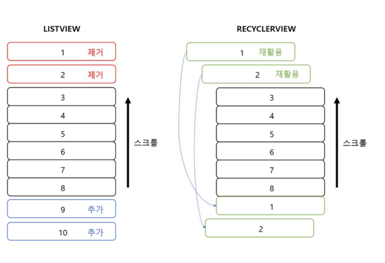 그 전에 많이 쓰이던 리스트 뷰는 새로운 데이터가 필요할 때마다 기존에 있던 데이터는 삭제하고 새로운 데이터를 만드는 형식이였는데