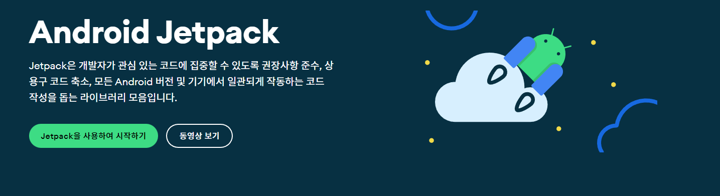 Jetpack은 개발자가 관심 있는 코드에 집중할 수 있도록 권장사항 준수, 상용구 코드 축소, 모든 Android 버전 및 기기에서 일관되게 작동하는 코드 작성을 돕는 라이브러리 모음입니다.