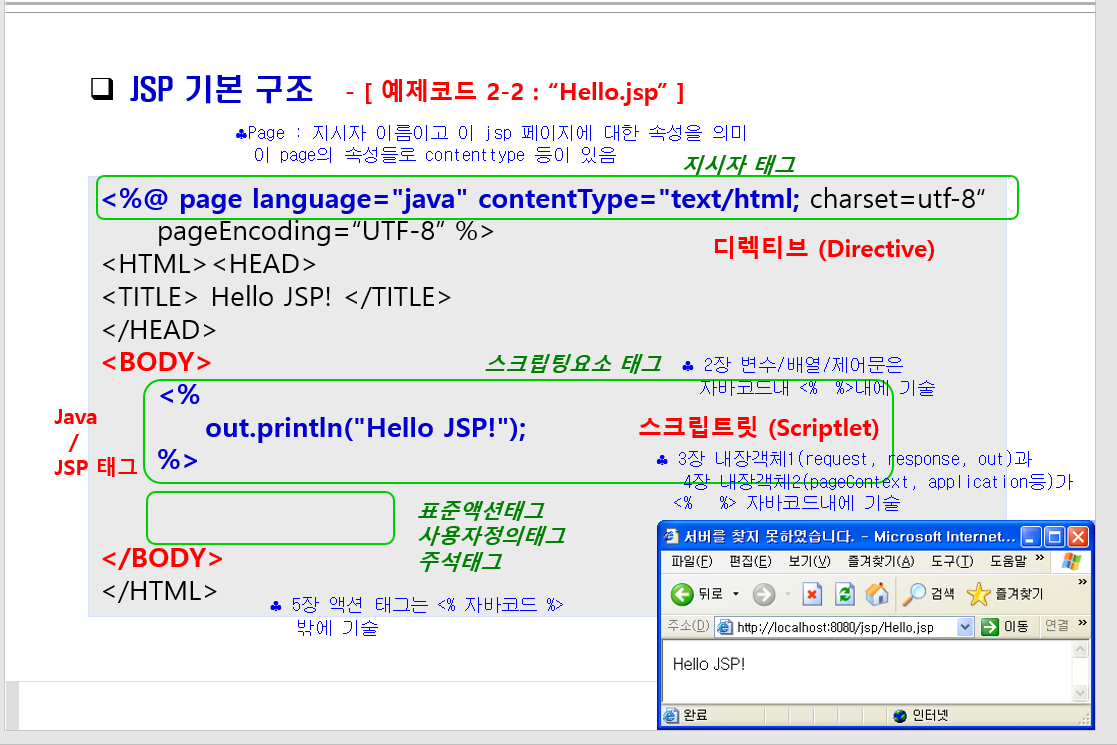 <%@ page ~~~ %> | <%@ page language="java" contentType ="text/html;charset=euc=kr" %> -> 언어가 자바 언어로 되어있으며 웹 페이지를 실행한 결과는 텍스트/html로 해주세요. 이 페이지는 한글이 포함되어 있습니다. |