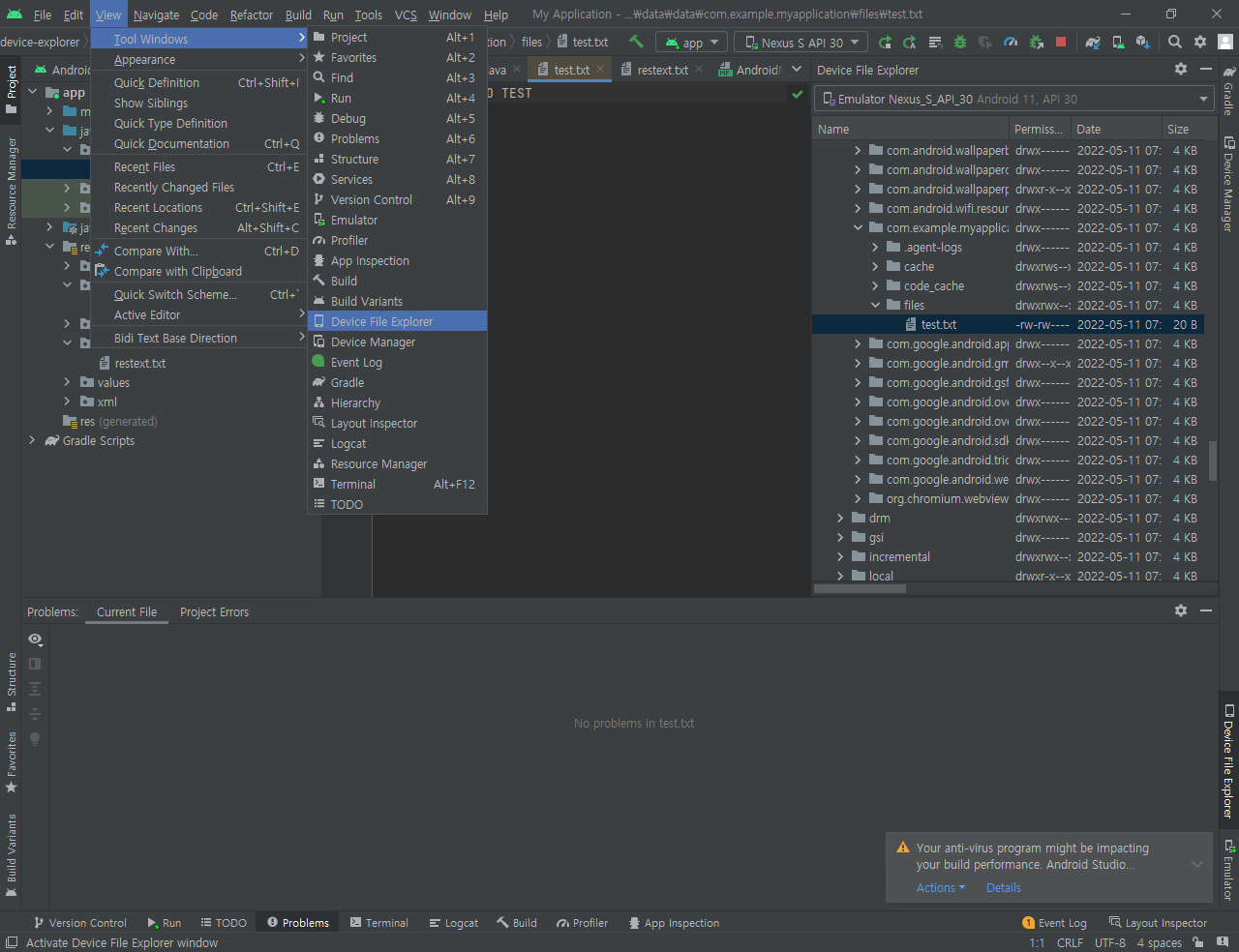 save 시 저장되는 경로 Tool windows -> Device file Explorer -> 패키지명 -> files 아래에 저장되어 있다.