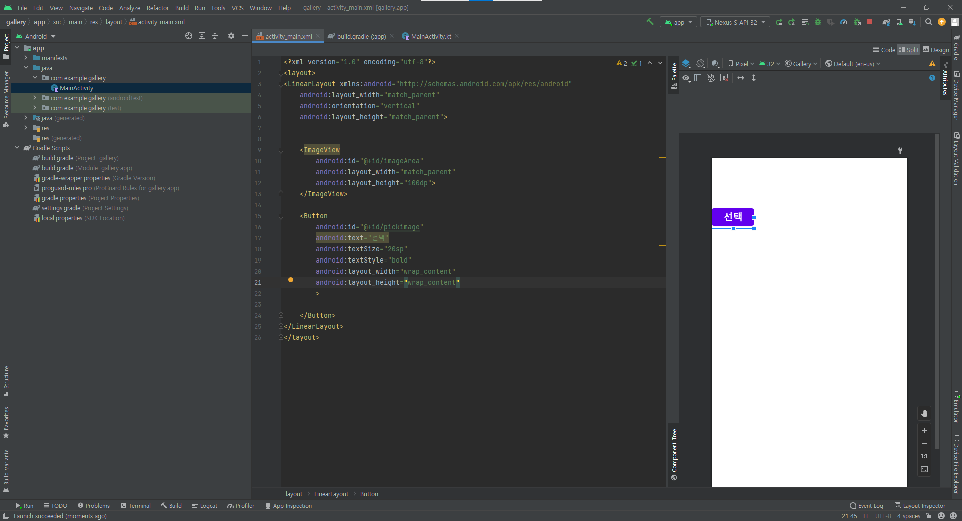 대충 이미지뷰와 버튼 하나 만들어준다.